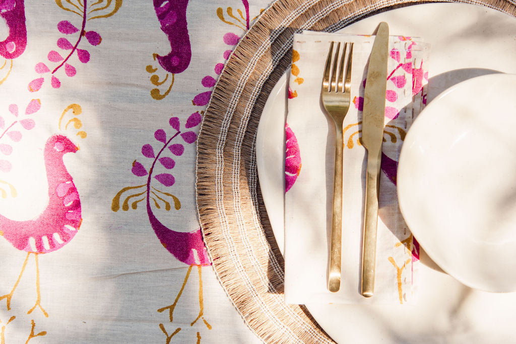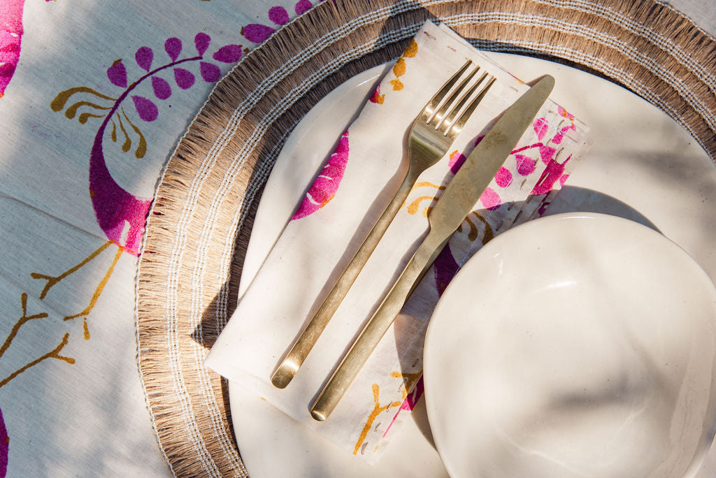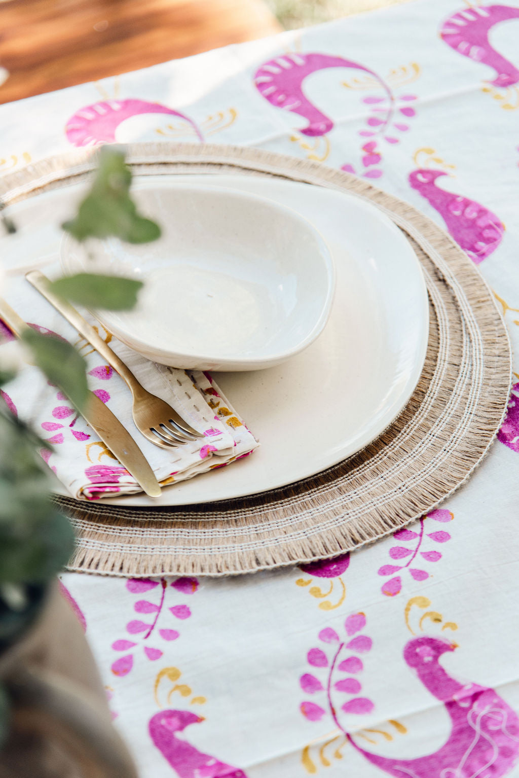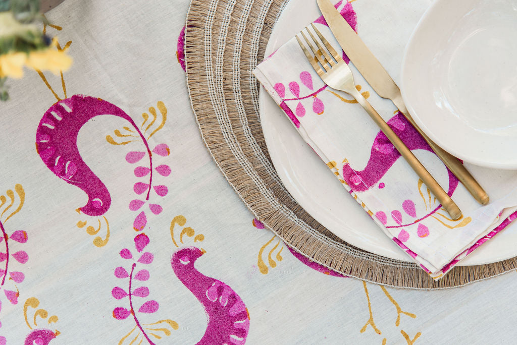 Set of 6 hand stamped napkins. Pink, yellow and white.  Size: 25cm x 14cm
