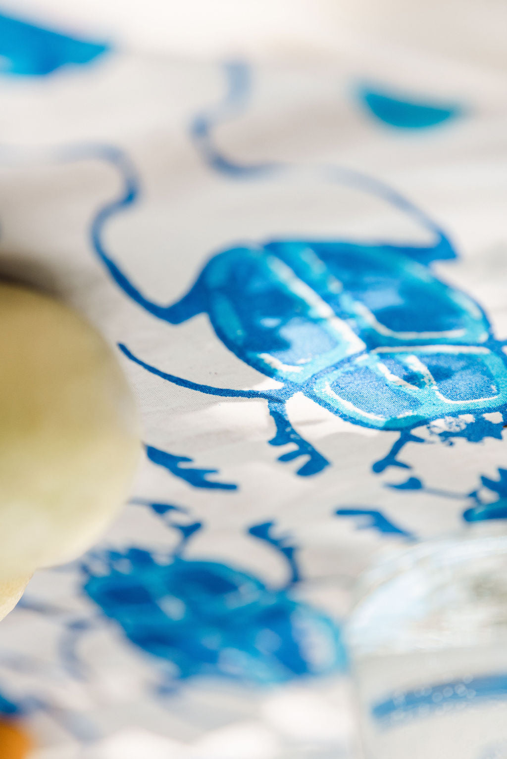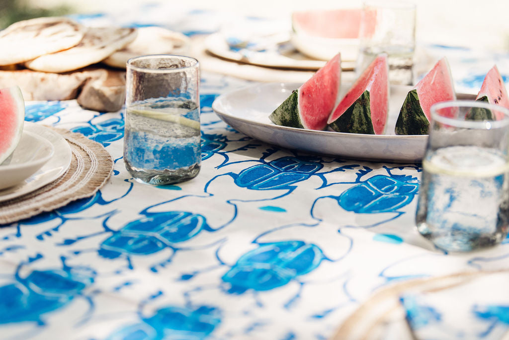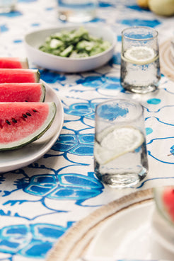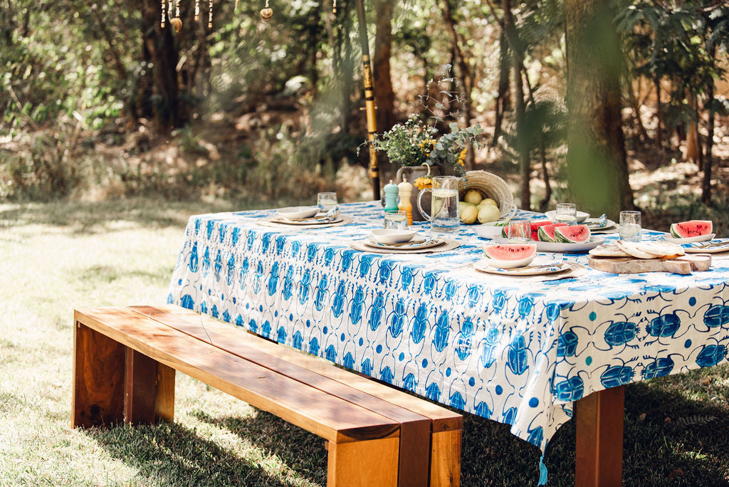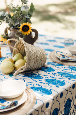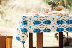Hand stamped tablecloth. Blue and white.  Size: 293cm x 193cm