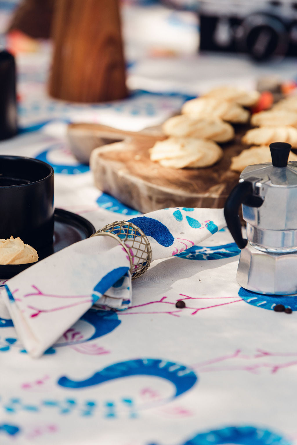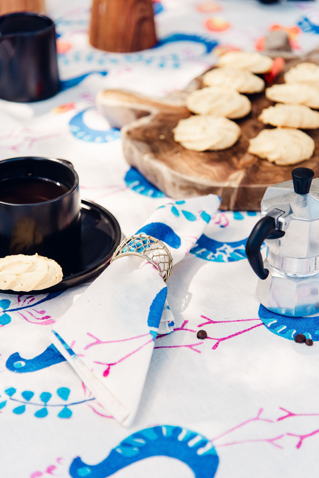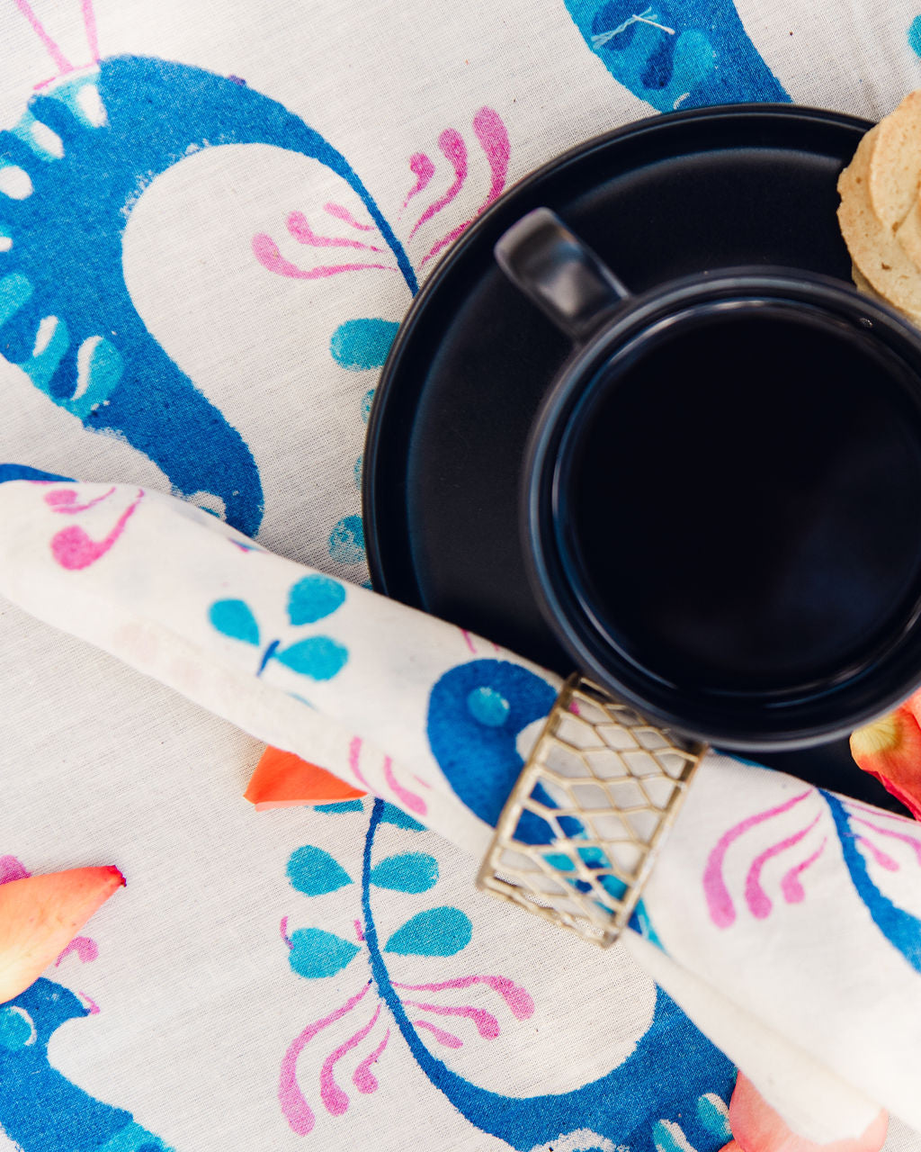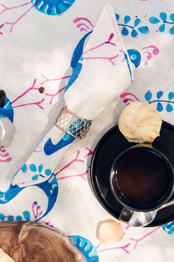 Set of 12 hand stamped napkins. Blue, pink and white.  Size: 25cm x 14cm