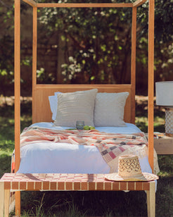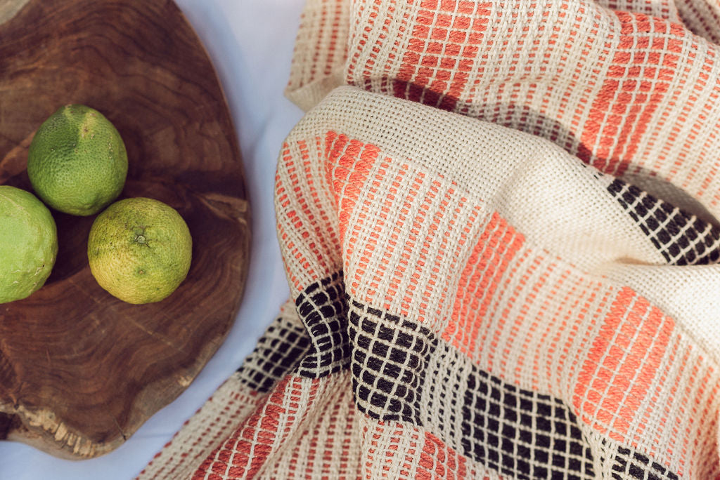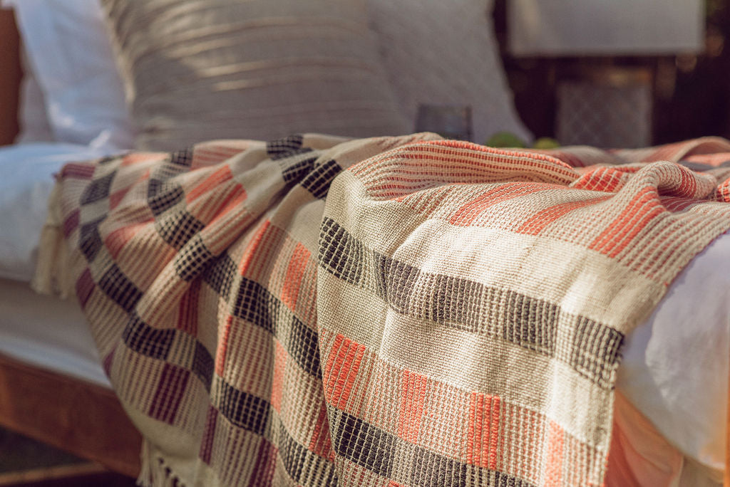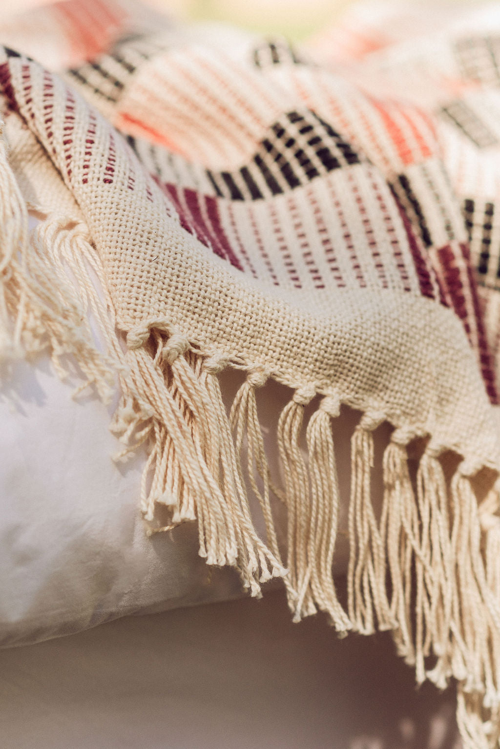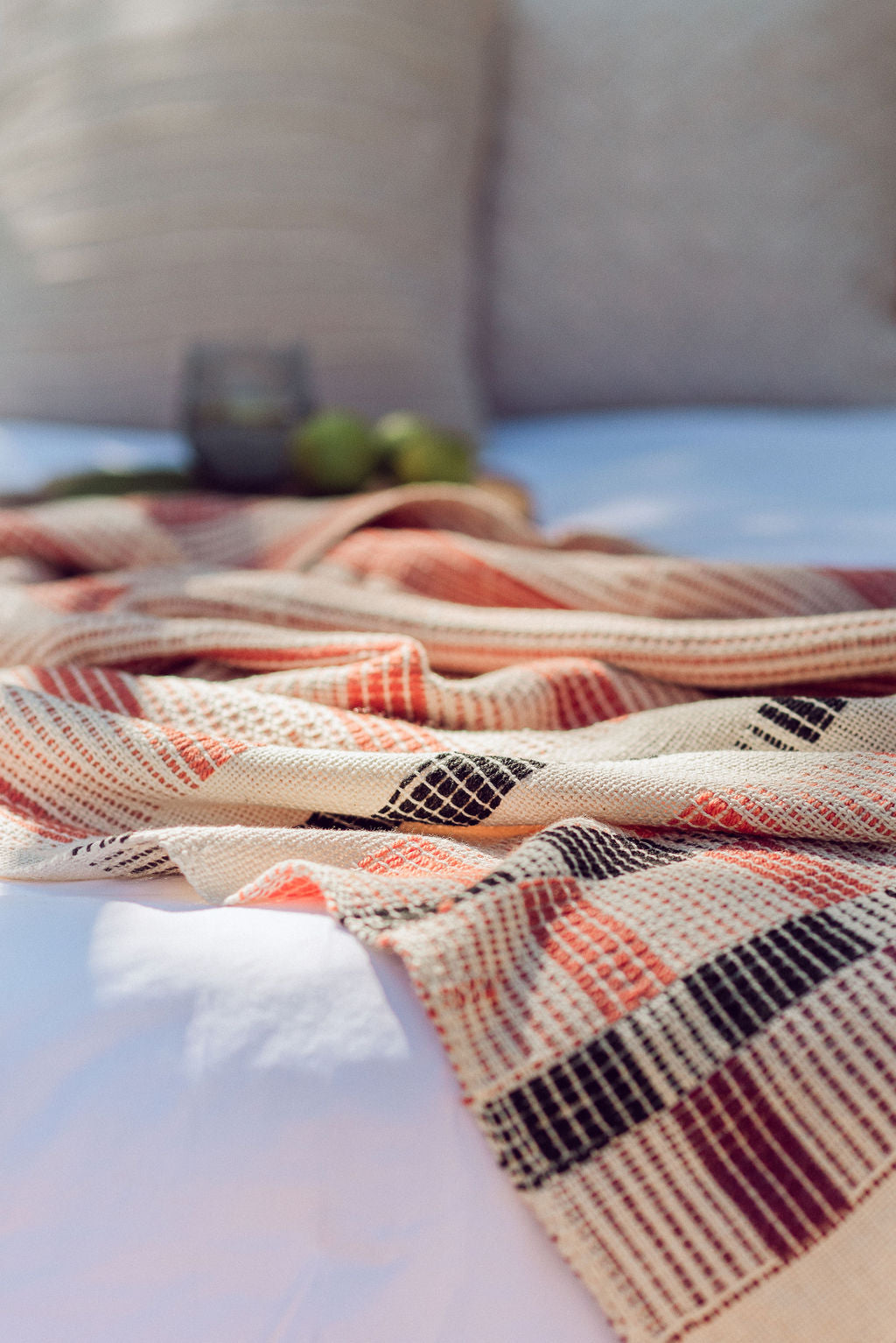A handwoven, large blanket.  Colour: Merlot, salmon, charcoal and white.  130cm x 210cm  60% Cotton, 40% Bamboo.