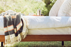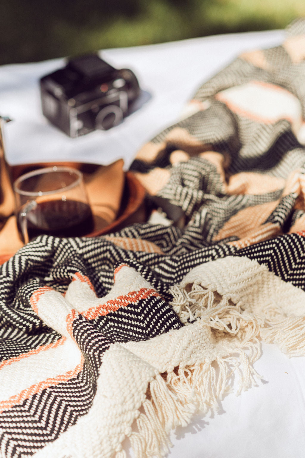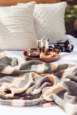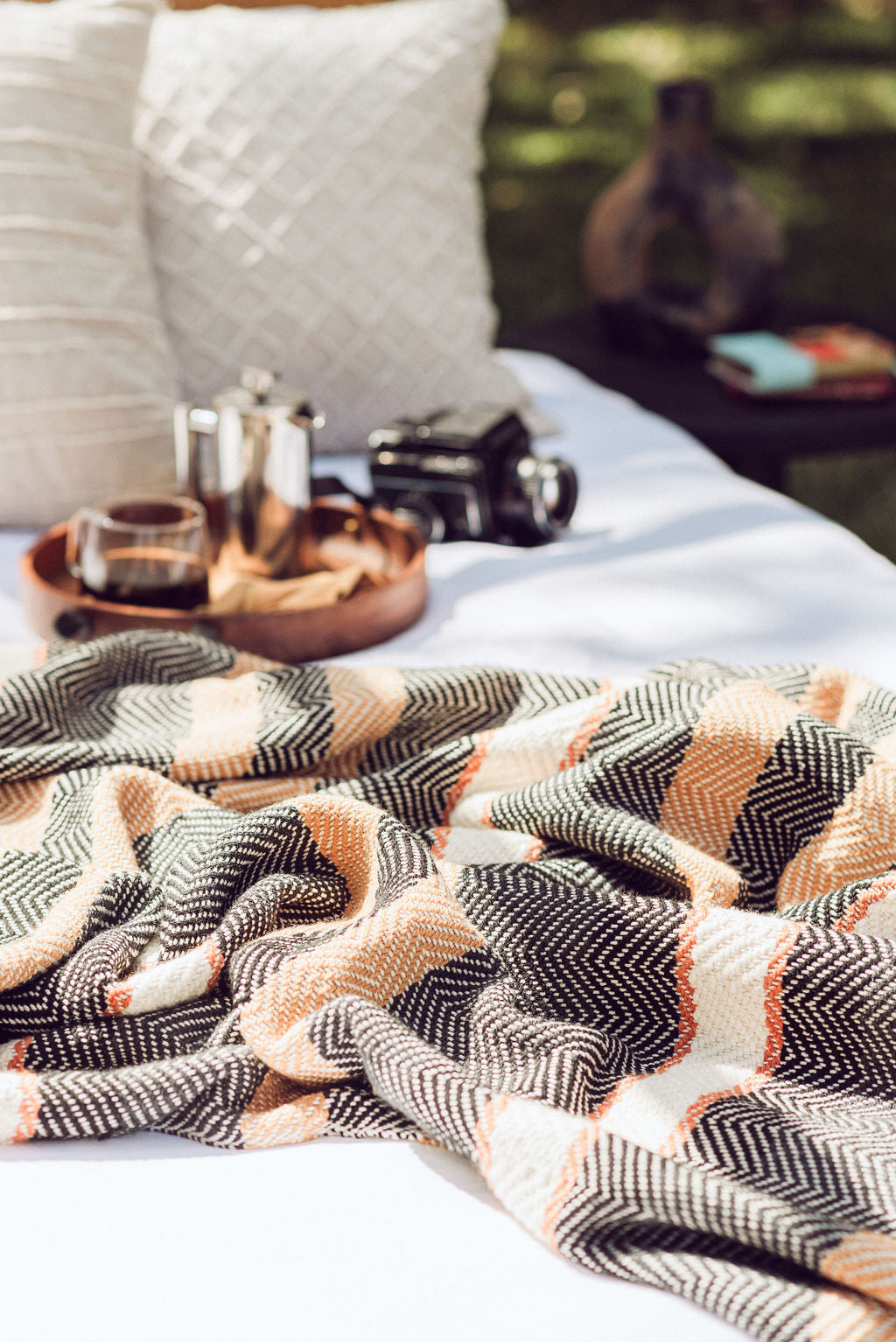A handwoven, large blanket.  Colour: Camel, charcoal and white.  160cm x 220cm  100% unbleached cotton.