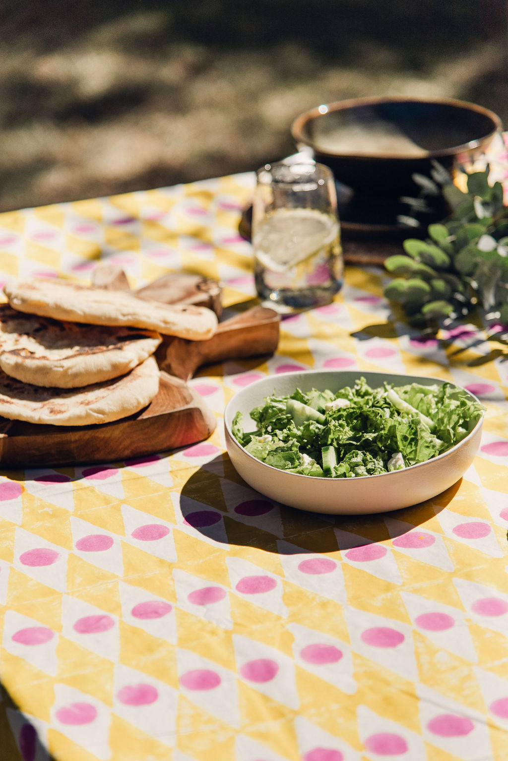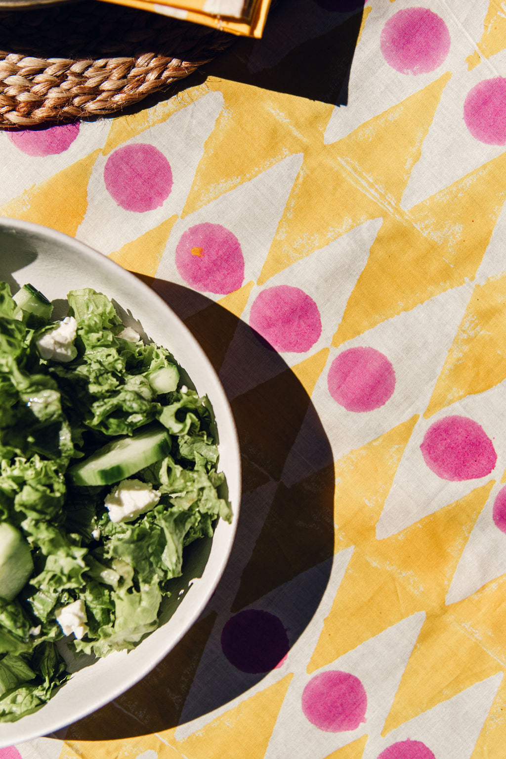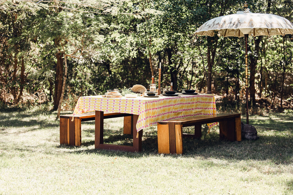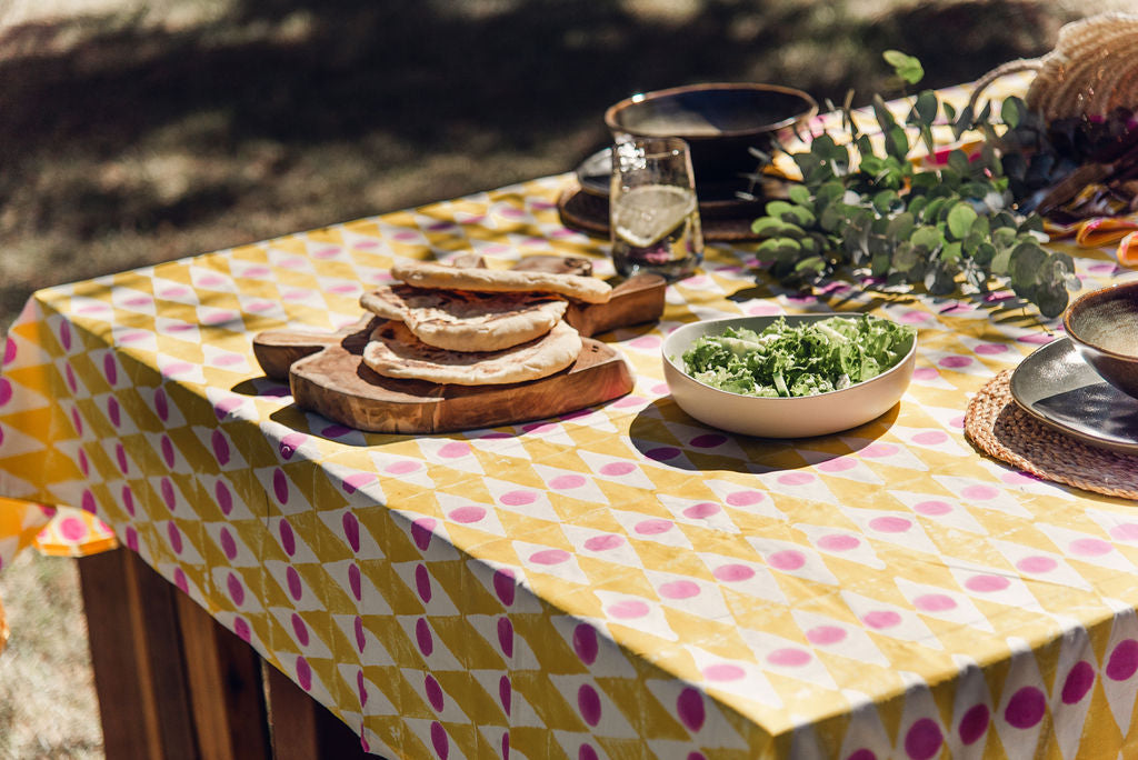 Hand stamped tablecloth. Yellow, pink and white.   Size: 300cm x 190cm