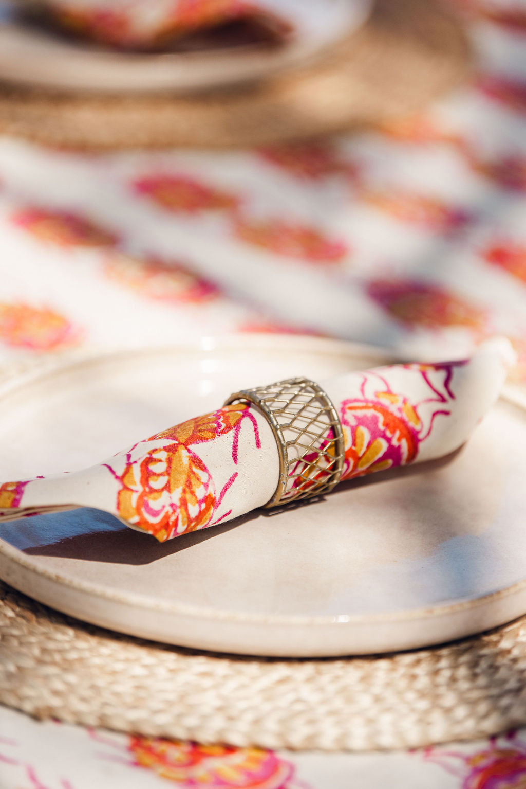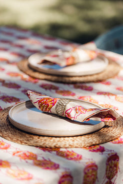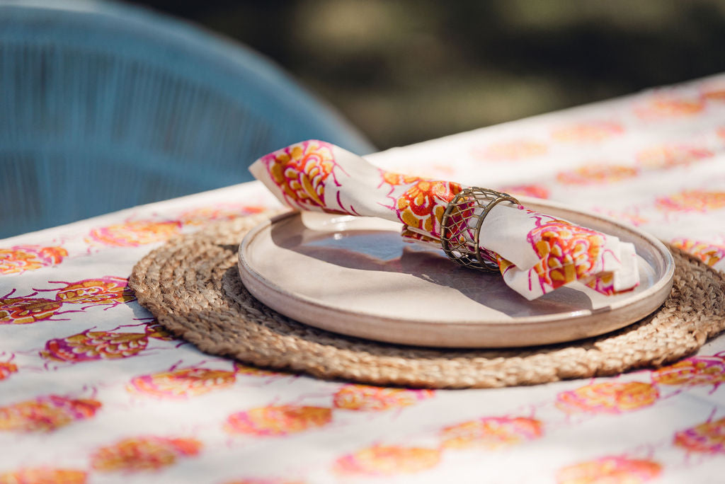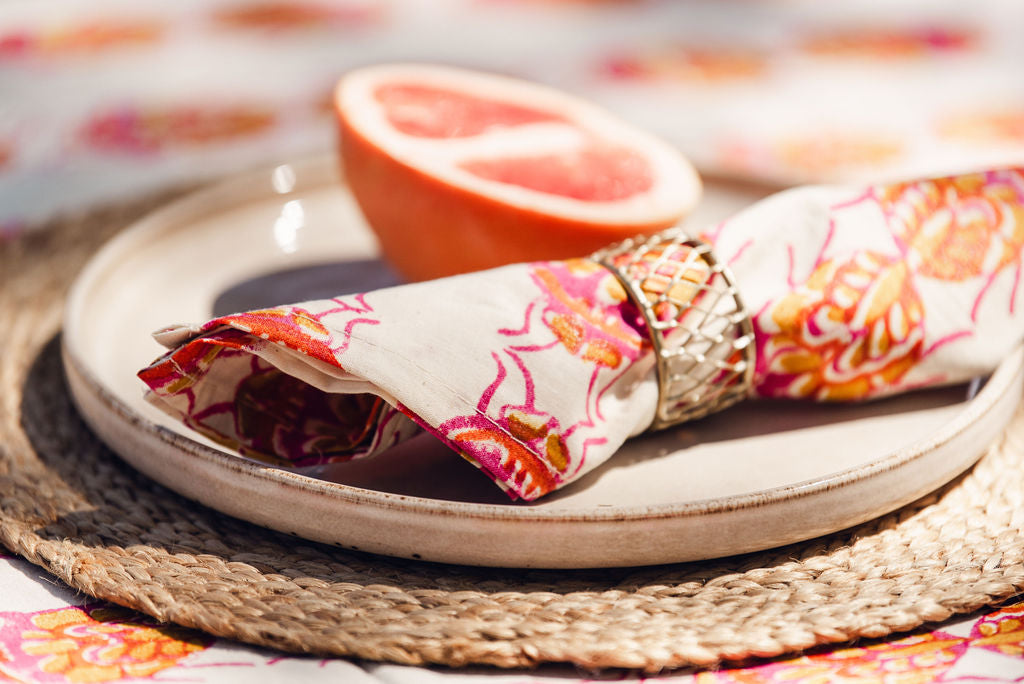 Set of 12 hand stamped napkins. Pink, yellow and white.  Size: 25cm x 14cm